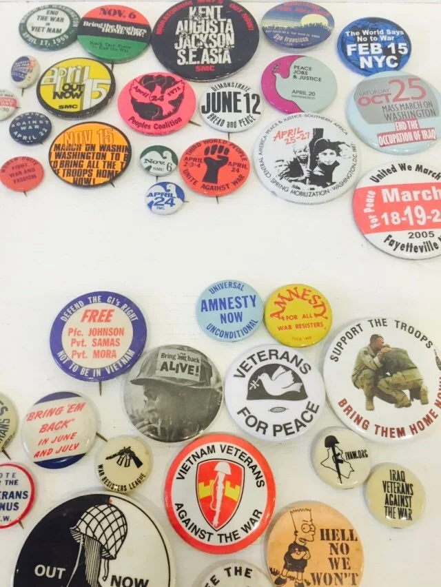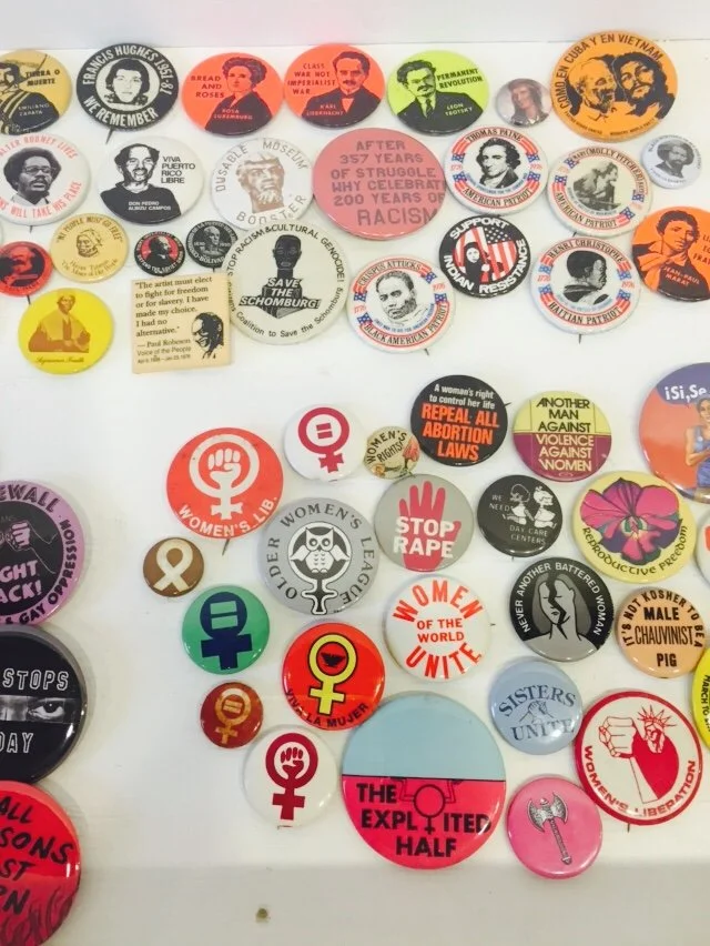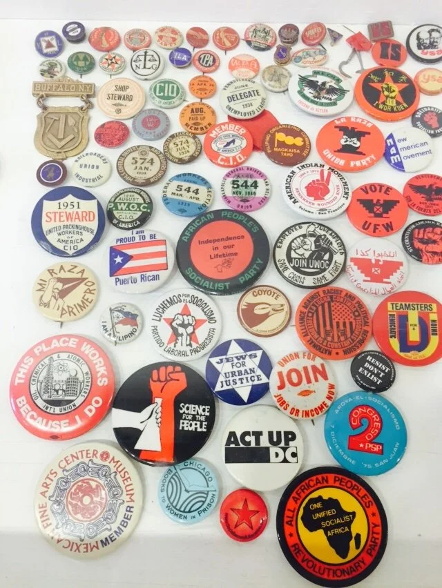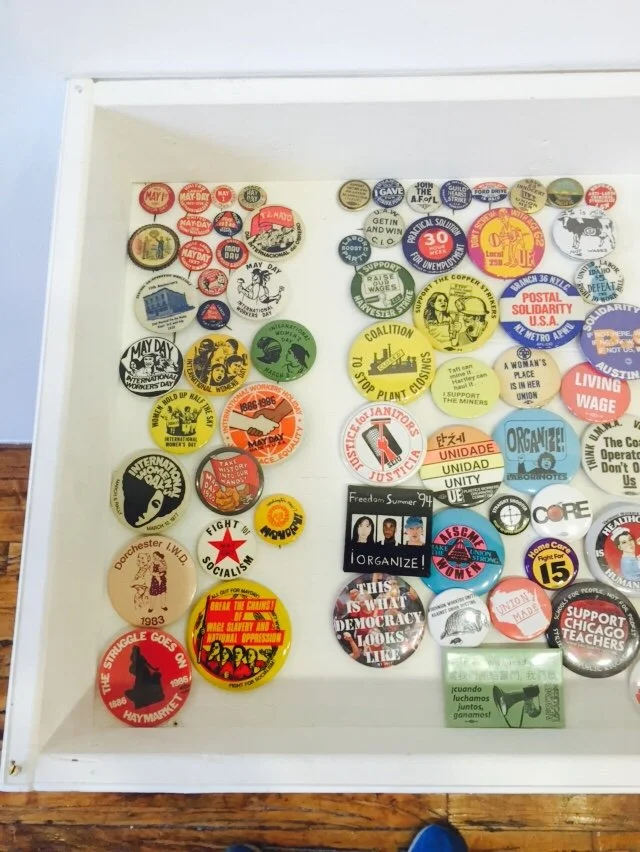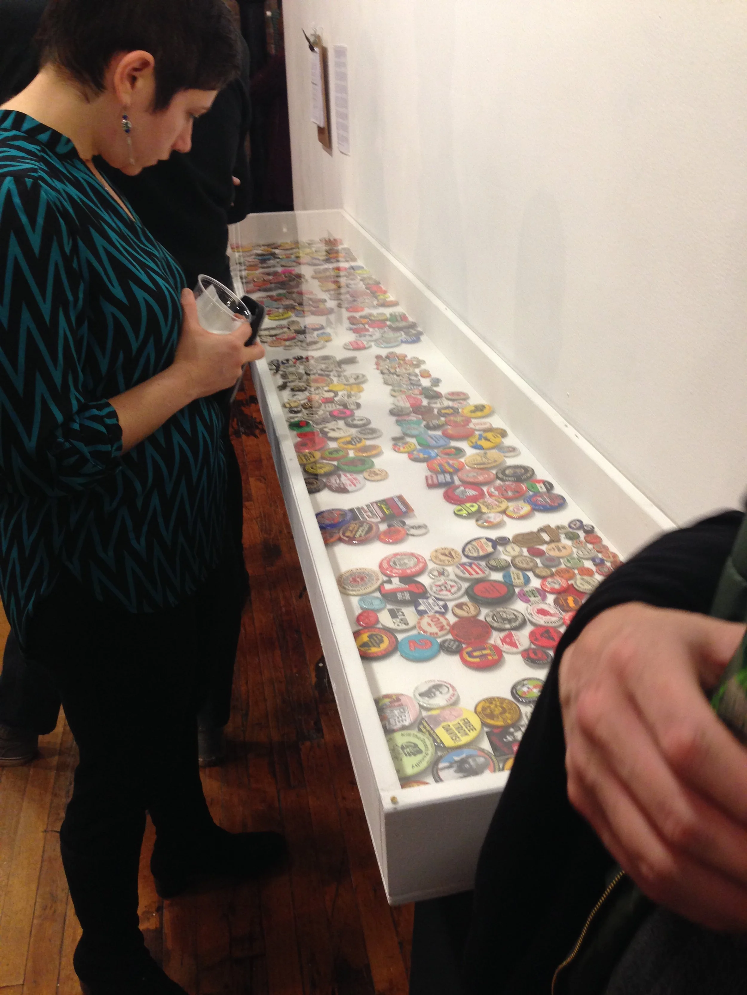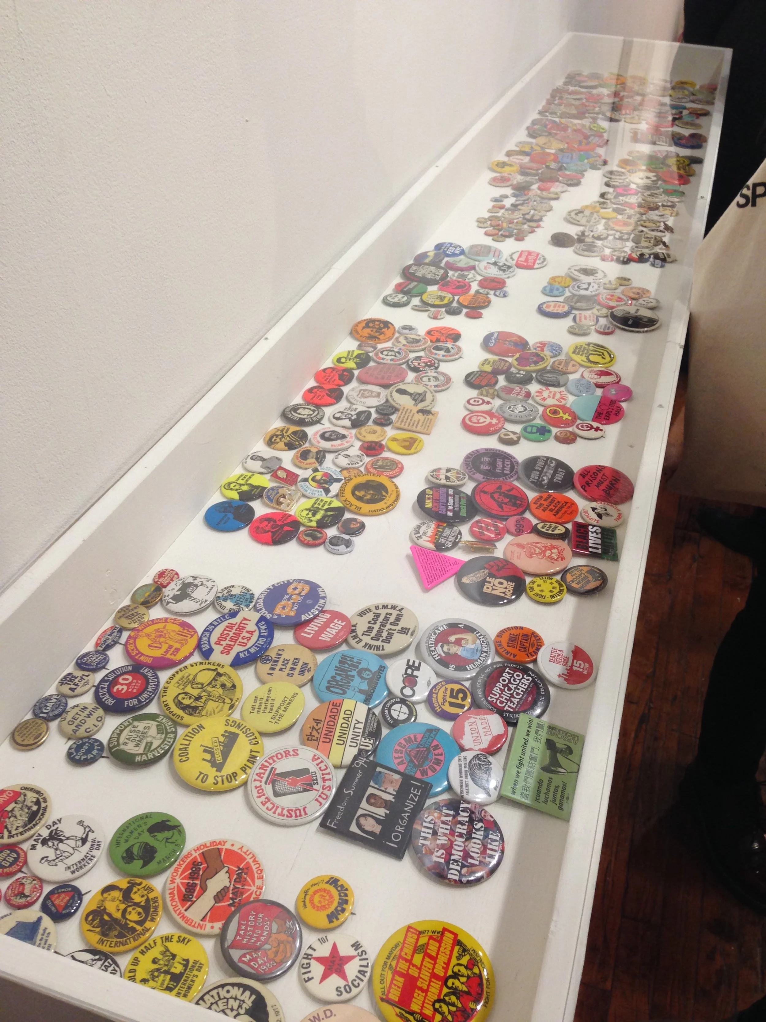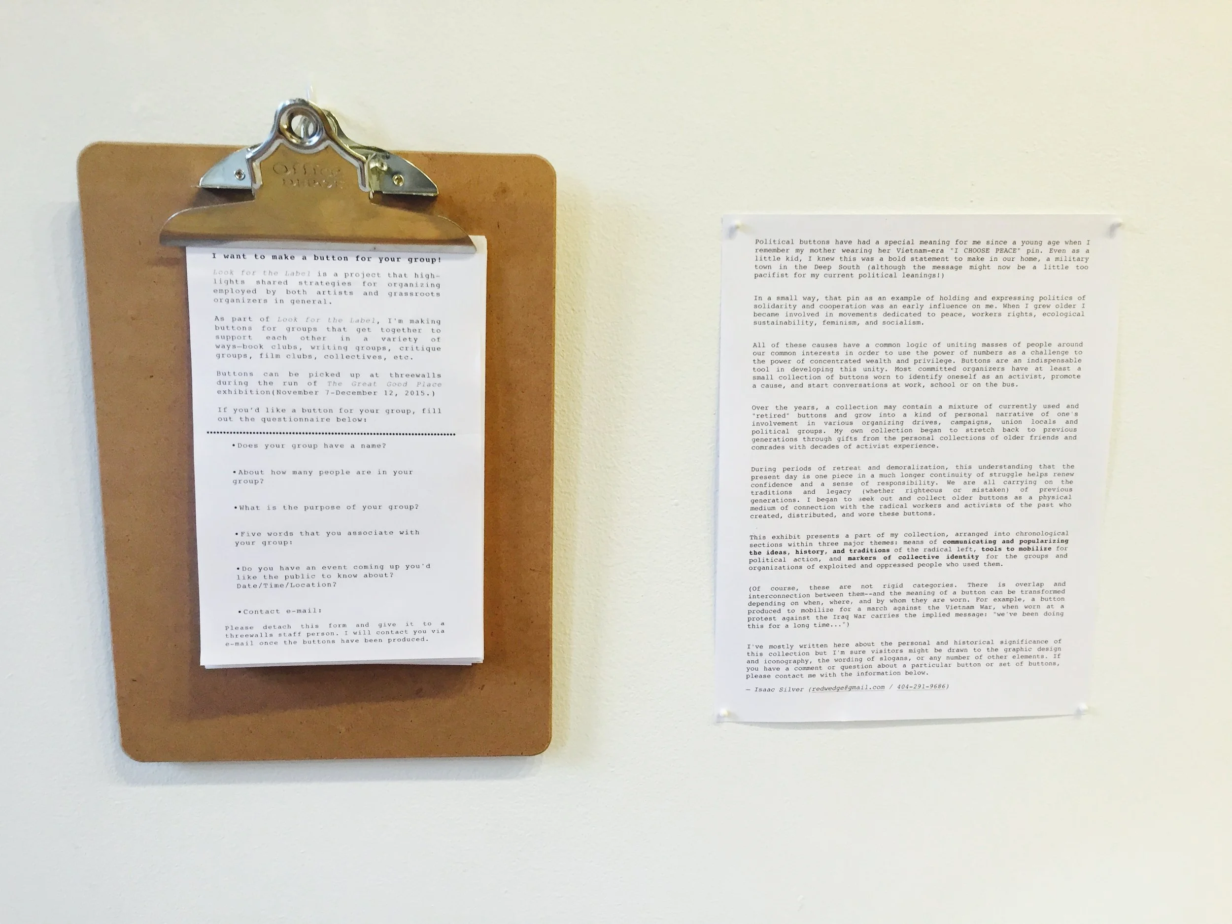 Look for the Label was a project developed specifically for the exhibition The Great Good Place. It showcased a portion of Isaac Silver’s collection of buttons from radical social movements around the globe in order to connect the arts-based organizing practices highlighted in the exhibition to grassroots organizing in general. Small groups that typically gather in informal settings to support each other (book clubs, critique groups, etc. …) have been invited to hold their meetings privately at Threewalls throughout the run of the exhibition. A new button will be designed, displayed, and distributed for each group that meets in the space.