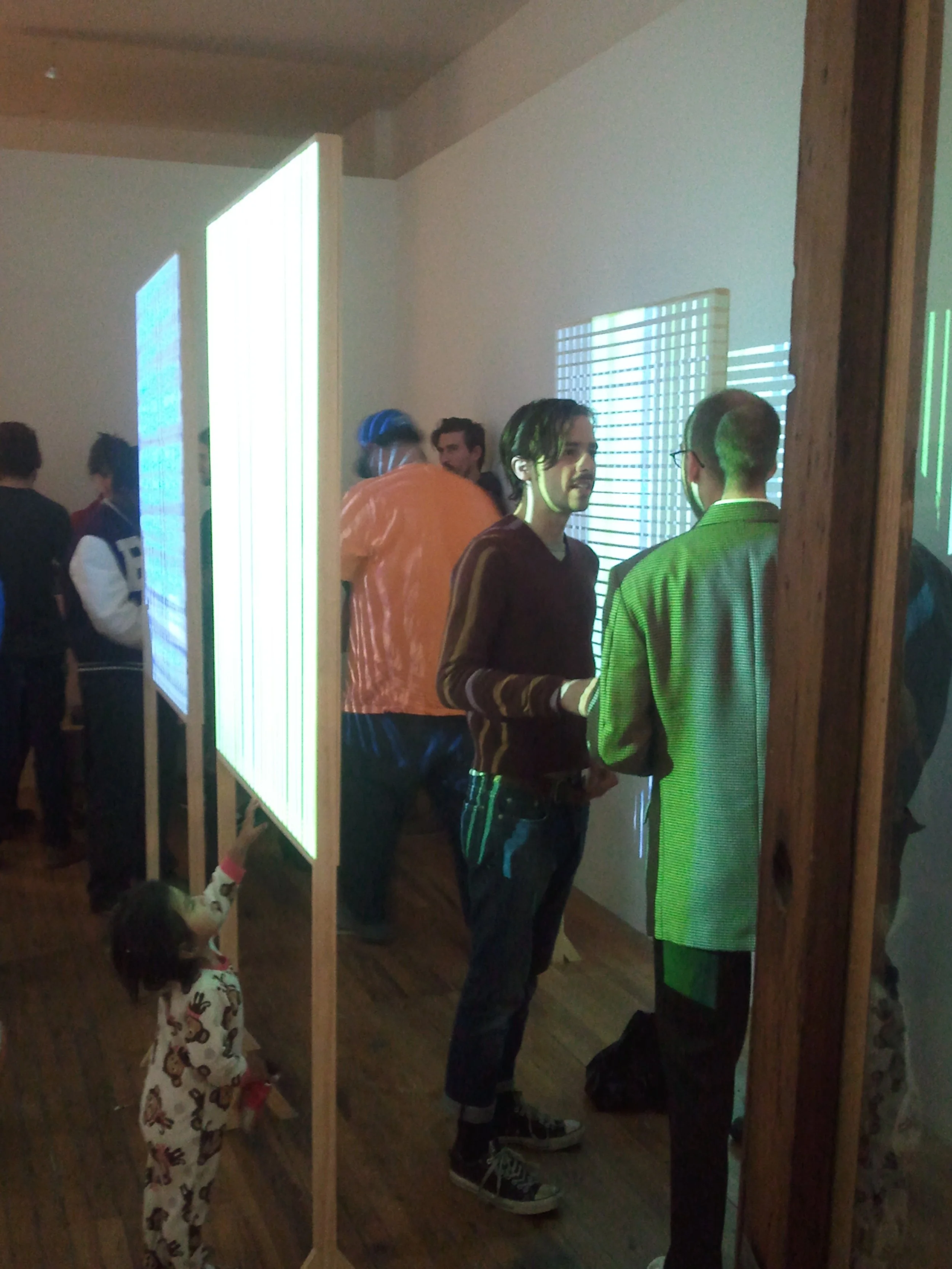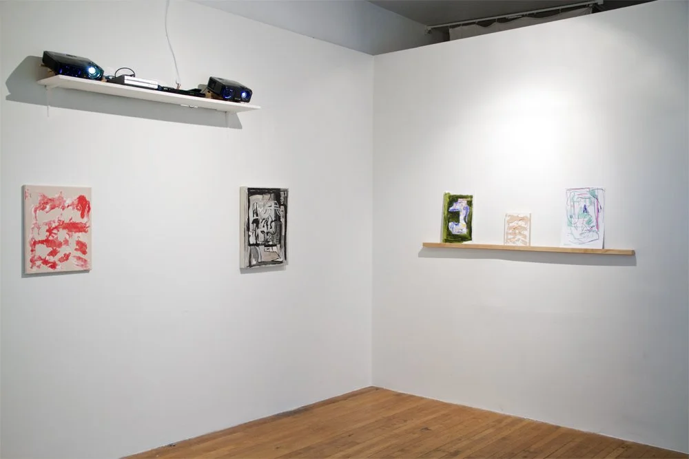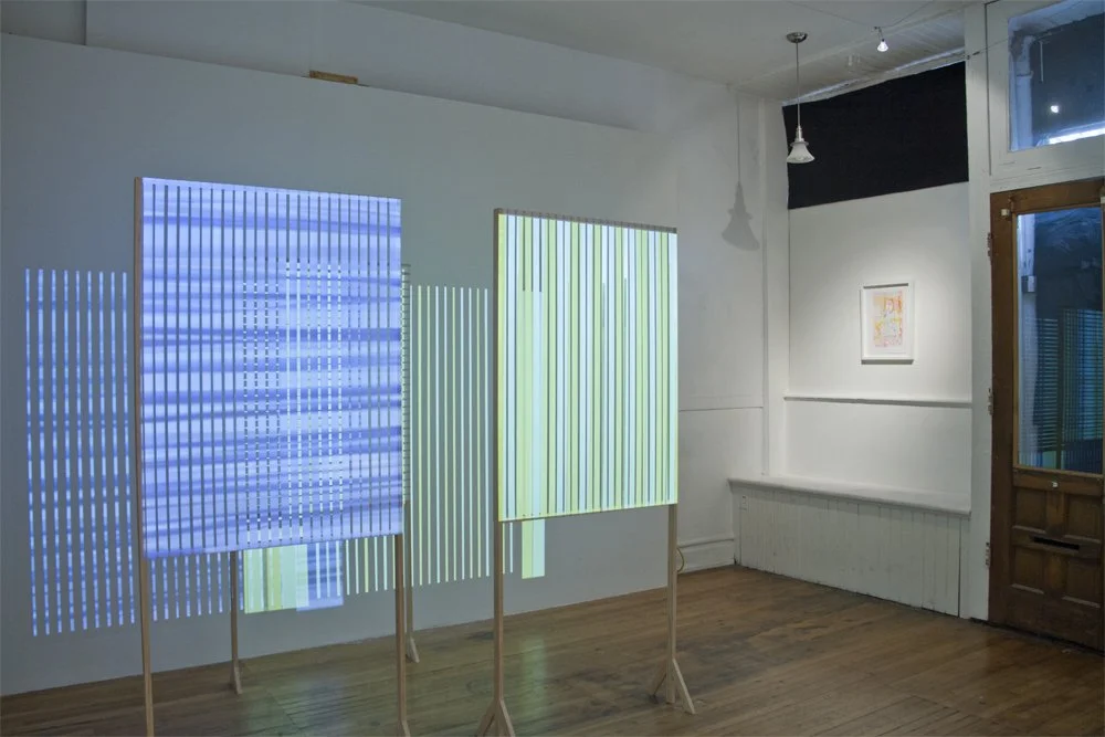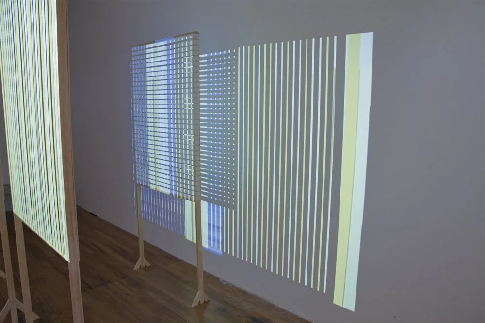 Newlon and Baldwin spent many hours in the gallery considering ways in which the spirit of their structures–still standing in Wisconsin, might find resonance in the gallery. The structures and projections in this show encourage movement through the gallery and awareness of scale. Each change in position reminds the viewer of where they stand in relation to the image source, the structures, and other people, as shadows interrupt the flow of light and the image changes scale on the wall beyond the frame.